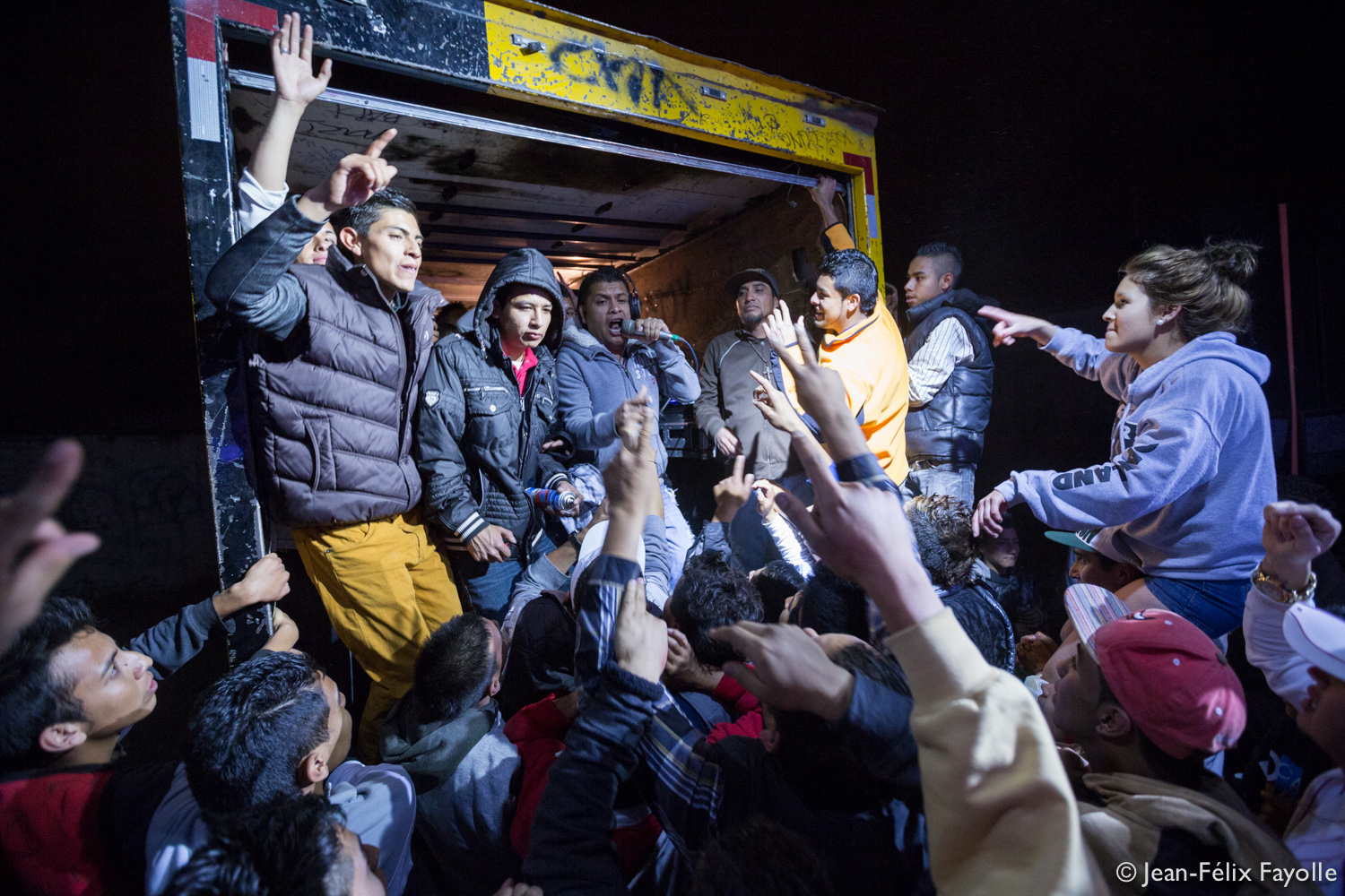 Dimanche 1er février, des jeunes du quartier de la Dos Grifota à Las Piedras, San Luis Potosi, ont nettoyé un terrain vague pour y organiser une soirée, un baile comme on dit ici. C’est “Le Roi du Wepa” (El Rey del Wepa) du Sonido Kiss qui animait la soirée. Aussi surnommé El Tontin, il est reconnu à un niveau international pour son style bien précis qu’est le Wepa. Il mixe principalement de la Cumbia et envoie des dédicaces au micro avec un effet d’echo. Il est respecté par la majorité des bandes de San Luis Potosi. Il travaille également à la Direction de la Jeunesse de Soledad de Graciano Sanchez, ville périphérique de San Luis. Etant dans l’accompagnement de ce projet, il a proposé d’organiser bénévolement un baile pour récolter des fonds pour le projet “Un Grito de Existencia”.