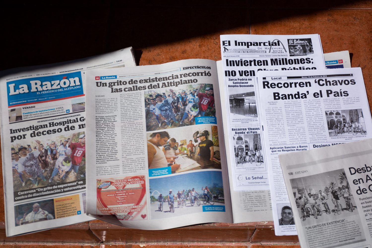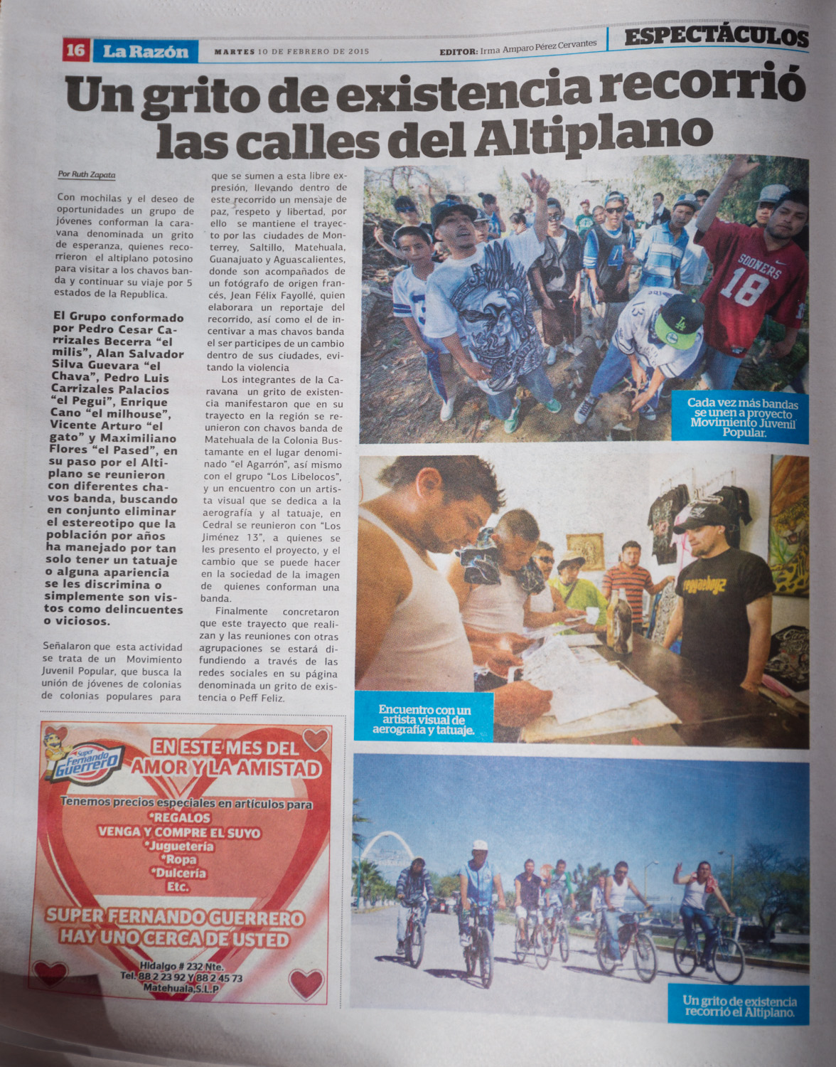 Dans la matinée du dimanche, après être passé dans un salon de tatouage et d’aréographie, nous sommes allés dans la commune de “El Cedral” où nous avons rencontré la bande des “Jimenez 13” (“Jimenez” pour le nom de leur rue, “13” pour le “Sur 13” qui représente le communauté latine au sud des Etats-Unis). Ces derniers sont plus branché rap et ils nous ont également présenté leur art. Nous espérons pouvoir y retourner demain pour mieux les connaître, camper sur place pour partir mardi en direction de Saltillo.