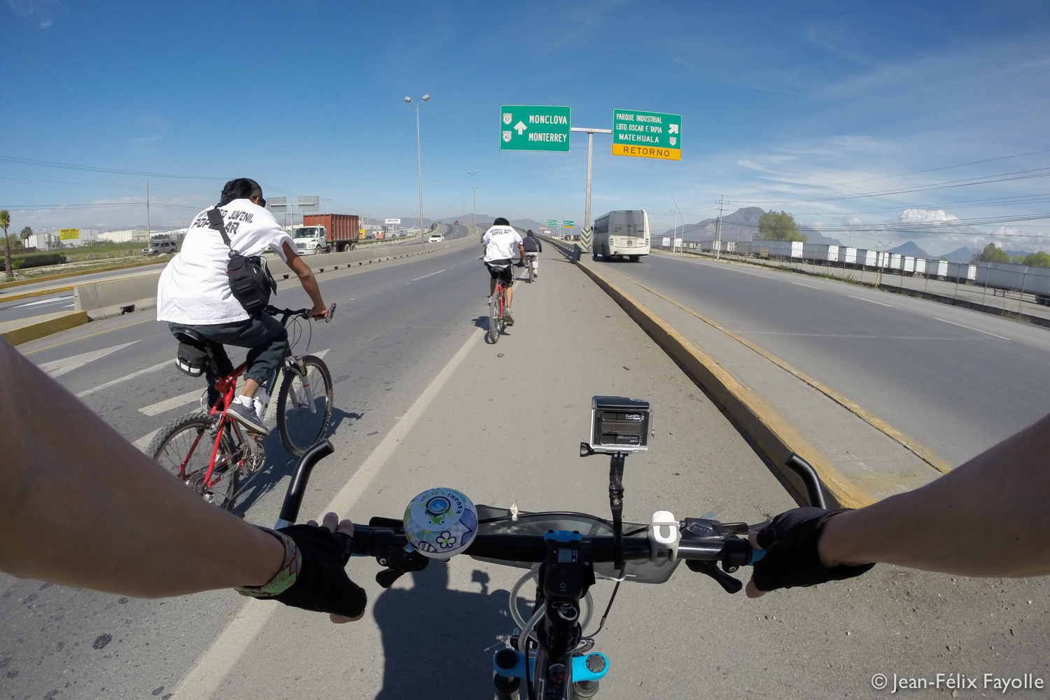 Nous avons pris la route vers midi après avoir chargé la voiture de tous nos bagages et du vélo qui nous sert maintenant de pièces détachées. Monterrey était à un peu moins de 100 km. Le paysage était magnifique avec des montagnes de plus en plus hautes. Le seule chemin pour arriver à destination est l’autoroute. Nous avons crevé à plusieurs reprises à cause des restes de pneus de camions éclatés au bord de la route et de leurs fils de métal. Nous avons avancé autant que possible, mais le brouillard épais et le froid (environ 6 degré en fin d’après-midi) nous a arrêté. Cesar a chargé trois vélos sur la voiture et a emmené trois membres de l’équipe jusqu’à notre destination finale. Je l’ai attendu dans un restaurant bien froid pendant près de trois heures avec Gato et Milhouse et ça m’a permis de rattraper le travail en retard. L’équipe s’est retrouvée au complet vers 23h à Guadalupe, ville en périphérie de Monterrey, où la famille de Chava, un de l’équipe, nous a accueilli.
